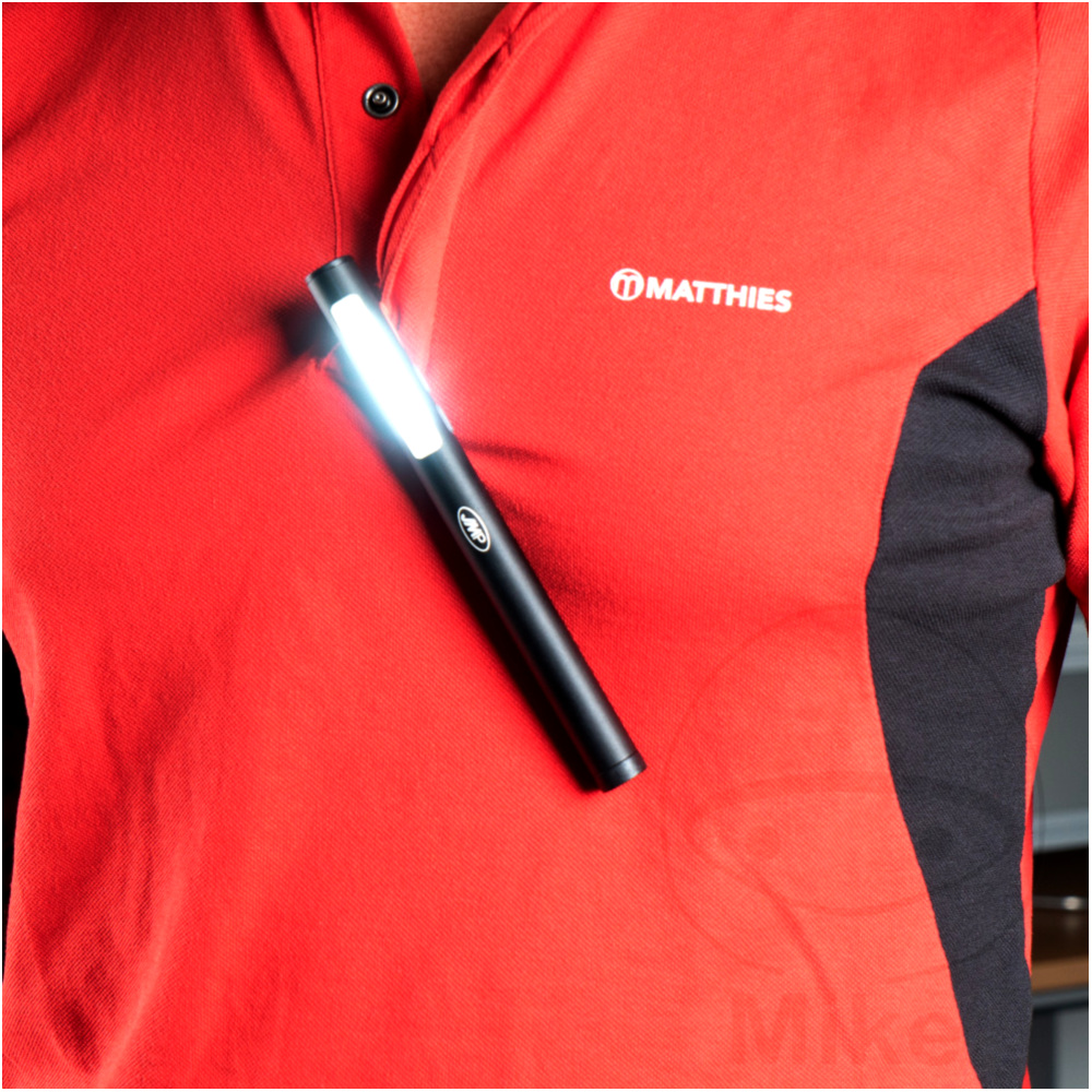 Die kompakte Inspektionslampe verfügt über eine Spotleuchte am Lampenkopf und über eine seitliche Flächenleuchte.Mit Halteclip für das Anstecken an die Taschen der ArbeitsbekleidungDurch die 2 Magnete am Halteclip und an der Stirnseite, kann die Leuchte ideal an magnetische Untergründe geheftet werden. So sind beide Hände frei.Lampengehäuse aus eloxiertem Aluminium