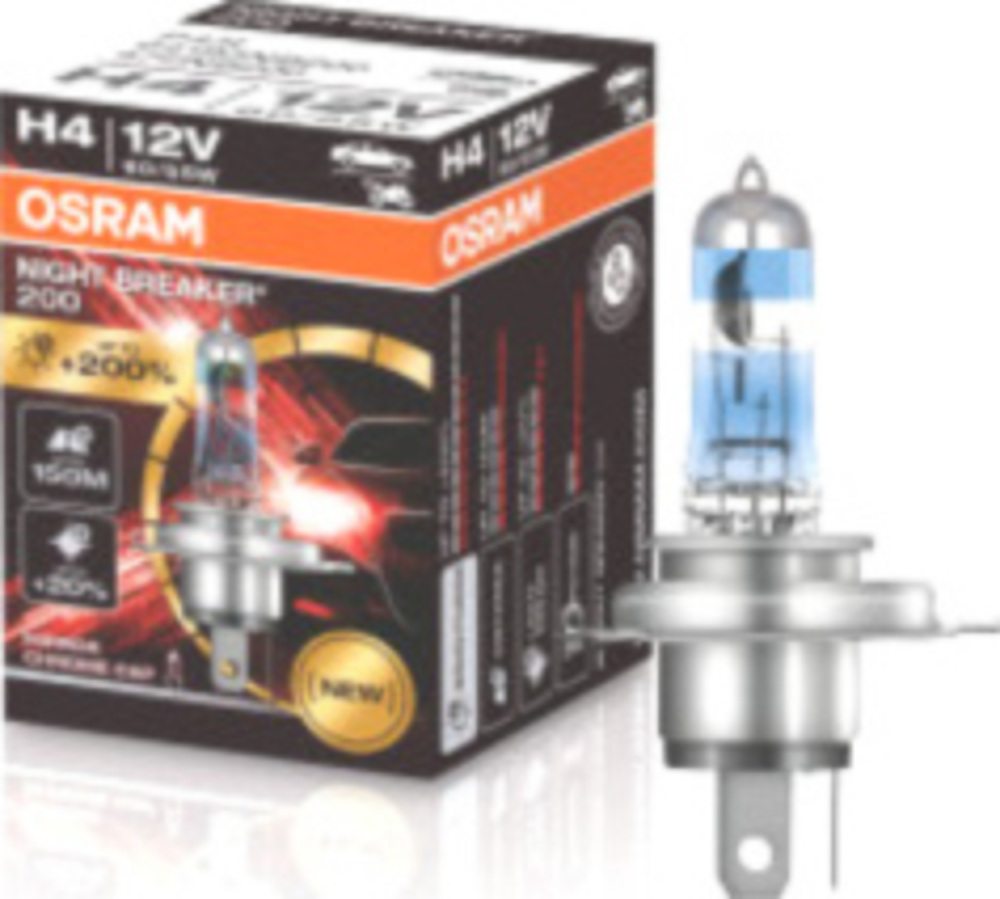 OSRAM NIGHT BREAKER 200 H4Das leistungsstärkste Halogenlicht von OSRAMErreichen Sie das nächste Licht-Level: mit NIGHT BREAKER 200 – der hellsten Halogen-Autolampe von OSRAM! Bis zu 200% mehr Helligkeit.Bis zu 20% weißerem Licht im Vergleich zu den gesetzlichen Mindestanforderungen. Erzeugt einen bis zu 150 m langen Lichtkegel. Mehr Licht und bessere Sicht können Fahrer dabei unterstützen, Verkehrsgefahren schneller zu erkennen und darauf zu reagieren. Die ideale Lampe für Autofahrer, die den Unterschied schätzen, den kraftvolle Fahrzeugbeleuchtung macht. Erhältlich als H4 und H7 mit neuer Spiegelchromkuppe.H4, Spannung: 12 V, Nennleistung: 60/55 W, Sockelausführung: P43T5