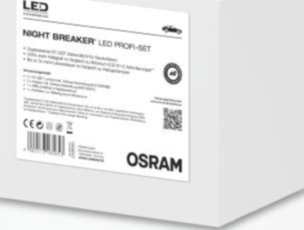Erste NIGHT BREAKER LED H4-LEDMit NIGHT BREAKER H4-LED kommt jetzt OSRAMs erste H4 LED-Nachrüstlampe mit Straßenzulassung auf den Markt.Die Nachrüst-Lösung bietet Autofahrern signifikante Vorteile: sehr hohe kaltweiße Farbtemperatur von 6.000 Kelvinbis zu 230 % mehr Helligkeit im Vergleich zu den Mindestanforderungen der ECE R112bis zu 5-mal mehr Lebensdauer im Vergleich zu Halogenlampen und zusätzlich 50 % weniger BlendungDas NIGHT BREAKER LED Profi-Set ist speziell für den Großhandel und enthält alle verfügbaren Adapter-Varianten.Gilt nur für die in der ABG aufgeführten Fahrzeugmodelle (siehe www.osram.de/ledcheck).Gemäß §22a StVZO ist Papierausdruck sowie Mitführen von Allgemeiner Bauartgenehmigung (ABG) erforderlich.Verwendung nur im Rechtsverkehr.Fahren im Linksverkehr (z.B. England) erfordert Rückrüstung auf Halogenlampen.OSRAM bietet passendes Einbauzubehör für die LED Lampen.