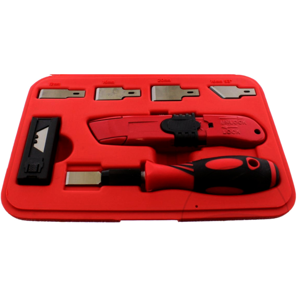 Bestehend aus:1 Handgriffje 5 Stück Wechselklingen 12, 16, 16 - 53° und 20 mm1 Universalmesser10 TrapezklingenKpl. in Kunststoff-Kassette