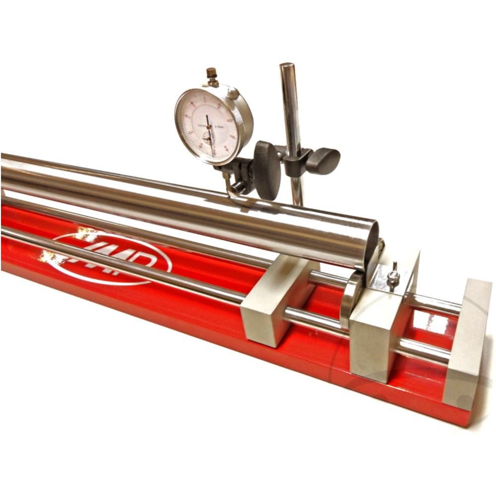 Mit dem Werkzeug lässt sich prüfen, ob die Standrohe ein Schlag oder eine Krümmung haben.Ausgestattet mit einer Hebelanzeige, lassen sich geringste Abweichungen feststellen.