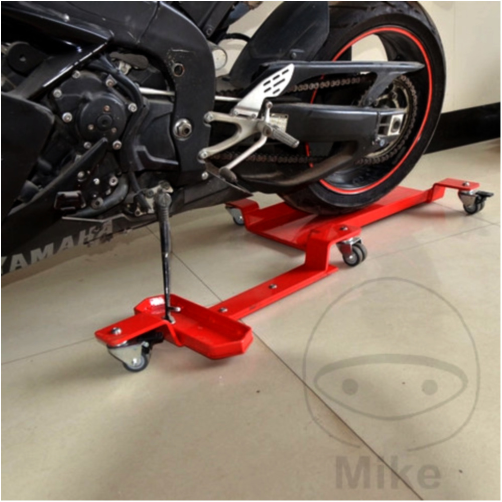 - Mit Hilfe der vier allseitig drehbaren Doppelrollen (zwei davon mit Bremsen) kann das Motorrad nun leicht in der Werkstatt oder Garage auf engstem Raum, ohne Kraftanstrengung gedreht werden oder quer vor einem Auto in einer engen Garage abgestellt werden