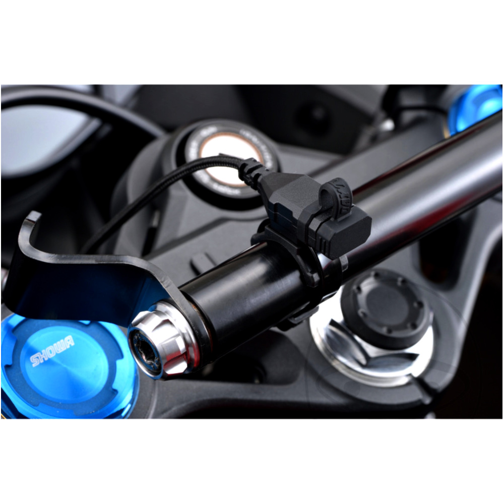 Das Gehäuse (Schutzart IPX3) mit 1,5 m Anschlussleitung und Batteriekabelschuhen erlaubt den flexiblen Einbau am Lenker- oder Rohrgestänge mit Kabelbindern. Anders als bei vergleichbaren Steckdosen ist ein Federklappdeckel montiert, der nach Gebrauch automatisch verschließt und im Fahrbetrieb nicht lose im Fahrtwind flattert, sondern am eingesteckten USB-Stecker anliegt.